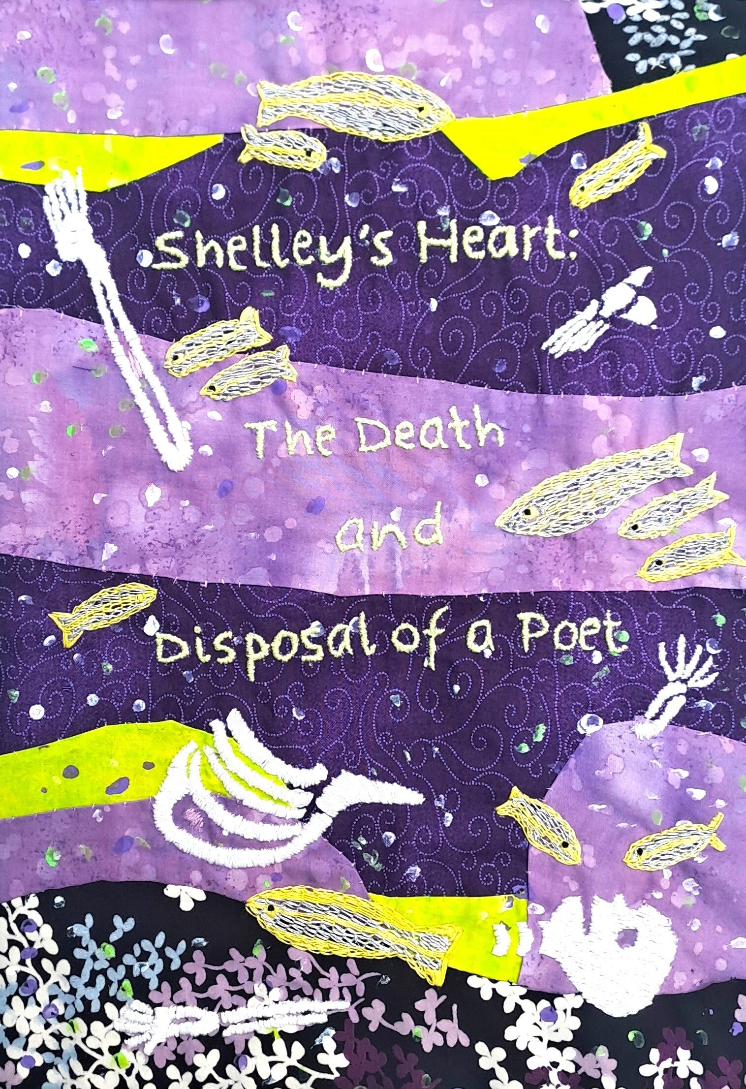 The embroidery panel is inspired by the sea and shows Shelley's broken skeleton - as the poem suggests the water and the sea creatures caused a great deal of damage to his body (I didn't want to get too gory). The silver and yellow fish are based on the Mediterranean fish sarpa salpa, sometimes known as the dream fish, and believed to be hallucinogenic.
